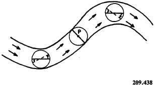 Figure 8-5-2.Illustration of vorticity due to curvature counterclockwise rotation in troughs (positive vorticity) and clockwise rotation (negative vorticity) in ridges. At a point between a trough and a ridge where there is no curvature, the inflection point, there is no spin imparted. This is shown at point P in figure 8-5-2. COMBINED EFFECTS. To find the rela-tive vorticity of a given parcel, you must consider both shear and curvature. It is quite possible that the two effects will counteract each other. That is, shear may indicate positive vorticity, and curvature indicate negative vorticity, or vice versa. See figure 8-5-3.When shear and curvature counteract each other, the amount of vorticity in each must be measured. The two figures are then added together algebraically to determine if vorticity is positive or negative. Measurements also indicate whether the vorticity is increasing or decreasing. When vorticity is increasing, the rotation is becoming more cyclonic. When it decreases, the converse is true. |