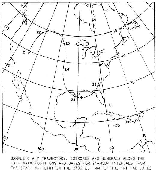 Click here to Order your Radar Equipment Online CONSTANT ABSOLUTE VORTICITY TRAJECTORIES (CAVT)It has been proved mathematically (under some rigid assumptions) that air parcels moving in the atmosphere conserve their absolute vorticity; that is, the absolute vorticity values do not change. The most important of the assump-tions is that no convergence or divergence occurs. Actual observations under conditions of no convergence or divergence bear out this theory. Therefore, as a parcel moves from latitude to latitude in the Northern Hemisphere it describes a definite pattern called a constant absolute vorticity trajectory (CAVT). Figure 8-5-4 is an example of a CAVT. Constant absolute vorticity trajectory is defined as the latitudinal path of an air parcel whose absolute vorticity is unchanging. Constant absolute vorticity trajectories are directly related to the movement of long waves.
