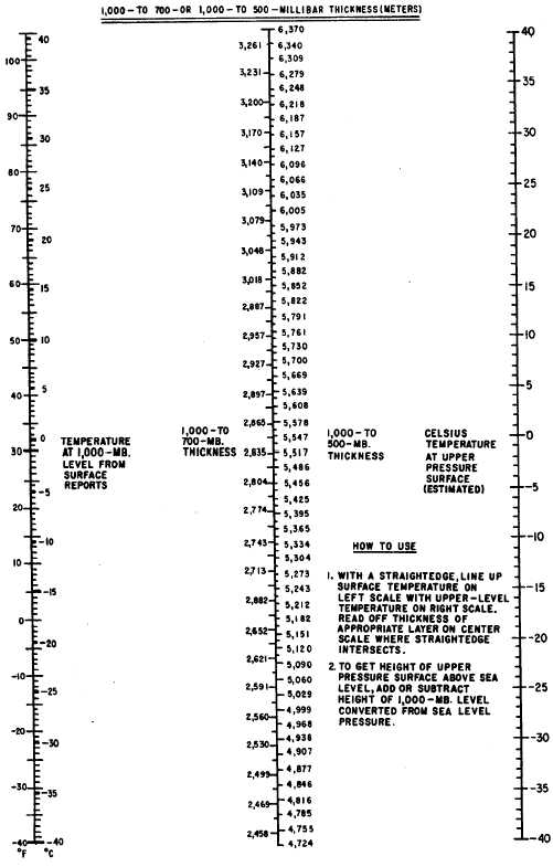 Click here to Order your Radar Equipment Online Extrapolating Upper-Level Heights A common analysis practice is extrapolation of upper heights from sea-level reports. The scarcity of upper-air-reporting stations in many regions of the world and the absence of upper-level data from stations that do report require that this procedure be used. This is a common practice in computer-analyzed constant-pressure charts. Extrapolated heights are plotted enclosed in parentheses.The thickness of a stratum or height of an upper level is computed using a known sea-level pressure and temperature and an assumed mean virtual temperature for the stratum. Tables and nomograms, derived from the hydrostatic equation, are also used for this purpose. Figure 8-1-1 contains a nomogram for com-puting the height of the 700- or 500-mb level using a known surface temperature and an estimated upper-level temperature. The upper-level temperature is usually estimated from past analysis and compensated for any changes which may have occurred since the last analysis; i.e., any cold or warm air advection. A step-by-step extrapolation procedure follows:1. Estimate the upper-level temperature. 2. Determine the height of the 1000-mb level. 3. Determine the thickness of the stratum, following nomogram directions.4. Algebraically add the 1000-mb height and the thickness of the stratum obtained in step 3. This is the height of the upper level above sea level.The 1000-mb height must be determined, because tables and nomograms use 1000 mb as the standard surface-pressure value. To compute its height, we assume 7 1/2 mb equals 60 meters of height, or 8 meters per millibar. Take the difference between the actual sea-level pressure (SLP) and 1000 mb and multiply this figure by 8. For example, a ship reports a sea-level pressure of 1015.0 mb. The difference between the reported value and 1000 mb is 15. Multiply this difference by 8. 15 x 8 = 120. The height of the 1000-mb level is 120 meters above sea level. SLP(mb) 1000 mb x 8 m/mb = 1000-mb height Minus () values indicate 1000-mb heights below mean sea level, and plus ( + ) values indicate 1000-mb heights above mean sea level. Given the following parameters, compute the height of the 700-mb level, using the nomogram shown in figure 8-1-1: Estimated 700-mb temperature 5.0C; sea-level temperature, 25.5C. REMEMBERthe nomogram contains 700-mb heights and 500-mb heights. The 700-mb heights are to the left of the center line.In step 4, algebraically add the thickness of the stratum just computed and the height of the 1000-mb level. For computational purposes, use the 120-meter height previously computed. The thickness of the 1000-700-mb stratum as com-puted from the above information should read approximately 2,957 meters. Because the reported sea-level pressure in this example is greater than the standard, you should have added the 120 meters to the height of the 1000-700-mb stratum. Your answer should read 3,077 meters. If the reported sea-level pressure is less than 1000 mb, subtract the 1000-mb height from the height of the stratum.Since we are working with assumed or estimated temperatures and not those of an ac-tual upper-air sounding, inversions anywhere in the stratum or non-representative temperatures at the surface or upper level will result in incorrect height computations. In the case of marked inversions of any type, the estimated height will be less than the "true" height, because the com-puted mean virtual temperature will be less (colder) than the true mean virtual temperature. Compensate for such inversions by using a higher estimate of the upper-level temperature. Higher estimates may be required in the following situations:1. In the vicinity of high-pressure cells where subsidence inversions are present2. Where surface inversions are indicated by stable weather phenomena such as fog3. When a frontal surface exists below the level to be extrapolatedA study comparing the true thickness of the 1000-700-mb and 1000-500-mb stratums to extrapolated thicknesses using temperature averaging showed the extrapolated thicknesses