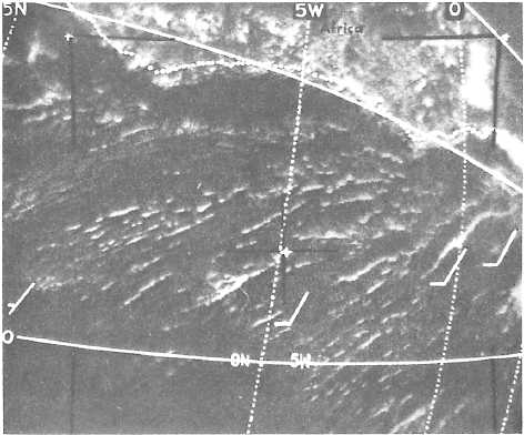 Click here to Order your Radar Equipment Online Wind Estimates from Satellite Pictures Clouds over the tropics, viewed from satellite altitude, reveal many features of the flow. The distribution of widespread cloud systems has definite relationships to major trough and ridge positions, and wind estimates for both upper and lower tropospheric levels can be obtained from analysis of cumulus and cirrus cloud formations as seen in singular satellite pictures or from cloud motion measurements taken from a series of pictures. Two levels of the tropical atmosphere are usually plotted and analyzed: in the lower troposphere, it is the gradient level, and in the upper troposphere, it is the 300-or 200-mb level. LOW-LEVEL STREAMLINES. Gradient level (2,000 to 3,000 feet) winds are most often chosen for analysis, because the wind frequency is fairly equal, and since cloud bases average 2,000 feet, balloons are often lost above this level. Ships surface winds can also be used to supplement the winds of this field, and satellite pictures permit wind determination from low-level cloud fields.Research has shown that many cumulus cloud lines observed between 10N and 10S over the Atlantic and eastern Pacific oceans are oriented in approximately the same direction as the surface wind. However, because the orientation of cloud lines relates to wind shear, these lines may depart considerably from the surface wind direction. Therefore, a great deal of caution must be exercised when using cloud lines to define low-level wind flow. There are no hard-and-fast rules that permit positive identification of the particular cloud lines that approximately parallel the surface wind. It has been observed that cloud lines that are very long, very narrow, and either wavy, zig-zag, or have knots (wide places along a line) are the type that most often parallel the surface wind. Figure 9-2-3 shows cloud lines that approximately parallel the wind flow. Surface wind reports are entered on the picture as white arrows. Two drawbacks to using the gradient level are (1) the orographic influences and (2) in the trade wind belt, tropical disturbances are not readily apparent at this level; the wind fluctuations at 2,000 feet may be small and noninformative. Thus, the choice of level to be analyzed must be based on local and synoptic peculiarities of the area. UPPER-LEVEL STREAMLINES. All the rules applicable to low-level streamlines also apply to the streamlines of the upper troposphere. Upper-level streamline analyses are primarily used to locate areas of cyclonic and anticyclonic flow. Anticyclonic outflow areas are the most important
