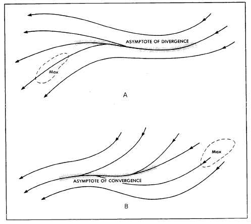Click here to Order your Radar Equipment Online Isotach maxima and minima have preferred areas of occurrence within the streamline pattern. The maxima are usually found upstream from centers of confluent wind flow on either side of asymptotes. Maxima also tend to occur down-stream from the centers of streamline divergence on either side of asymptotes. See figure 9-2-14. In the trades, or any other major east-west current, elongated maxima are usually found near Figure 9-2-15.Isotach maxima in broad easterly flow; maxima usually