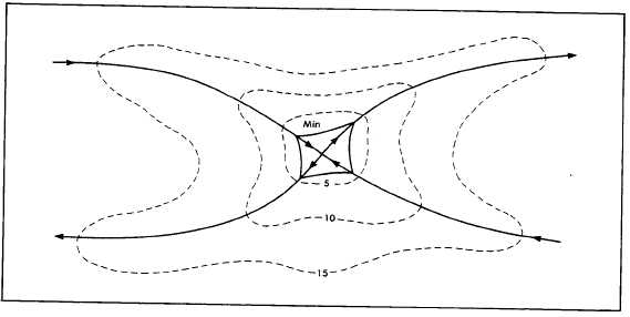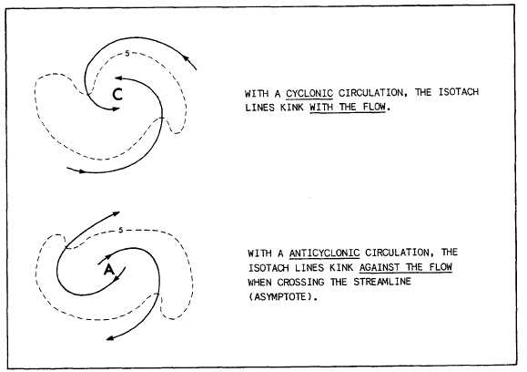 parallel streamlines and are sometimes found side the center of the current. Figure 9-2-15 shows that in very broad currents, two or more maxima may exist side by side. Isotach spacing reflects the strength of the wind; the higher the wind speed, the tighter the spacing. Isotach minima occur at all singular points and also along asymptotes. Around neutral points, they take on a saddle-like appearance away from the area of minimum winds. See figure 9-2-16. From the illustrations presented, you can see that isotachs kink when they cross stream-lines. With cyclonic circulations, they kink with the flow (in the same direction). With anticyclonic circulations, they kink against the flow. Figure 9-2-17 illustrates these two patterns. Before you finalize your analysis, look over your chart objectively and ask yourself the following questions: 1. Do the streamlines conform to the general flow pattern? 2. Have I justified throwing out every wind report that I could not draw to? 3. If I cannot justify discarding a wind report, is there any way I can draw to it? 4. Have I drawn the streamlines parallel to the plotted winds, rather than at an angle? 5. Is the chart consistent with other levels? 6. Is the chart consistent with history? 7. Are the streamlines and isotachs consistent? 8. Have I drawn any unnecessary lines?