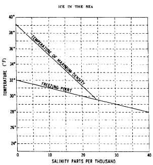 Figure 1-1-4.-Relationship between temperature of max-imum density and freezing point for water of varying salinity.freeze at 1.9C. However, before surface waters will freeze, the entire water column must cool to its temperature of maximum density. Therefore, shallow waters (of low salinityless than 24.7 ) freeze more rapidly than deeper water. As you can see, the freezing of sea water is gov-erned primarily by temperature, salinity, and depth; however, this ice formation can be retarded by winds, currents, and tides.In the open sea, the first sign that the sea surface is freezing is an oily opaque appearance of water. This appearance is caused by the formation of minute ice needles (spicules) and thin plates of ice (frazil crystals). As the formation process continues, the surface attains a thick soupy consistency termed grease ice. Next, depending on the wind, waves, and salinity, an elastic or brittle crust forms. The elastic crust (nilas) has a matte appearance, while the brittle crust (ice rind) is shiny. As the crust thickens, the wind and sea cause the ice to break up into rounded masses known as pancake ice. With continued freezing, the pancake ice forms into a continuous sheet.The formation of sea ice usually begins with the onset of autumn, and the first ice usually appears in the mouths of rivers that empty into shallow seas, such as that off northern Siberia. During the increasingly longer and colder nights of autumn, ice forms along the shorelines (fast ice) and becomes a semipermanent feature that widens and spreads. When islands are close together, as in the Siberian Sea, fast ice blankets the sea surface, and bridges the waters between all land areas.On the average in the Northern Hemisphere, sea ice is at a minimum in September, while at a maximum in March. In the Southern Hemisphere these times are nearly opposite; minimum in March and maximum in September.SEA ICE CLASSIFICATION. Sea ice is sub-divided into young ice, first-year ice, and old ice.Young Ice. This ice forms in one year or less, and its thickness ranges from 10 to 30 centimeters (4 to 12 inches). It is further classified as gray ice and gray-white ice.First-year Ice. This ice is a more or less un-broken level of ice of not more than one winters growth that starts as young ice. Its thickness is from 30 centimeters to 2 meters (1 foot to 6 1/2 feet). First-year ice may be subdivided into thin first-year ice, medium first-year ice, and thick first-year ice. The latter is more than 4 feet thick.