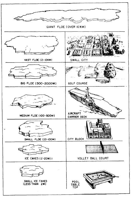 Figure 1-1-5.-Sizes of sea ice. Old Ice. Old ice is extremely heavy sea ice that has survived at least one summers melt. It occurs primarily in the arctic and antarctic polar packs as a vast mass of converging, crushing, and dividing ice floes of various ages, sizes, shapes, and thicknesses that drift around the Arctic Basin and Antarctica. Old ice may be subdivided into second-year ice and multi-year ice.SIZE. Generally, sea ice is categorized into seven sizes. Refer to figure 1-1-5 for relative sizes and a comparison to other more common features.TOPOGRAPHY. The terms most fre-quently used to describe the topography, or configuration of the ice surface, are related to the degree of surface roughness. Figure 1-1-6 illustrates the following types of topography:Rafted Ice. This type of topography occurs when ice cakes override one another. Rafting occurs when wind forces ice cakes or ice floes together. It is associated with young and first-year ice.Ridged Ice. Ridged ice is much rougher than rafted ice and occurs with first-year ice. Wind and weather can eventually smooth the surface of the ridges.Hummocked Ice. Hummocking occurs with old ice. It is defined as ice piled haphazardly into mounds or hillocks. At the time of its formation, hummocked ice is similar to rafted ice; the major difference being that the hummocked ice, because of its thickness, requires a greater degree of pressure and heaping.DRIFT. Drift refers to sea ice, as well as broken off portions (outer edges) of fast ice that move along with wind, tides, and currents.Direction. Pack ice, sea ice covering more than half of the visible sea surface, usually drifts to the right of the true wind in the Northern Hemisphere (left in the Southern Hemisphere). Observations show that the actual drift is about 300 from that of the wind direction, or very nearly parallel to the isobars on a weather map. The drift more closely follows the wind in winter than in summer. In summer, the tides play a bigger role in the movement of the ice. Speed. A close estimate of the speed of drifting pack ice is possible using the wind speed. On the average, the drift of ice in the Northern Hemisphere ranges from 1.4% of the wind speed in April, to 2.4% of the wind speed in September. Although wind is the primary driving force, the presence or absence of open water in the direction of the drift greatly influences the speed of drift. Ice-free water in the direction of the drift, no matter how distant, permits the pack ice to drift freely in that direction. Ice-clogged water, on the other hand, slows the ices forward movement.WATER FEATURES. Naval operations in and around fields of sea ice can be hazardous. The movement of massive floes of ice can cut off ships from open water, and worse yet, the ice may close in around a ship, leaving it stranded in a sea