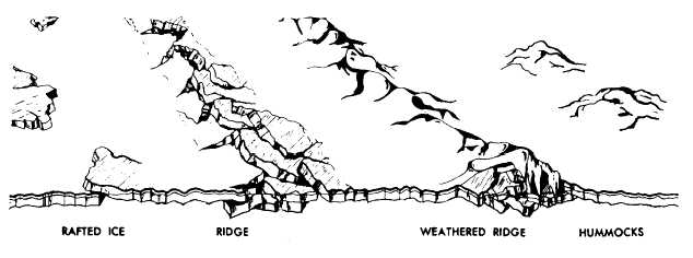 Figure 1-1-6.-Various types of ice topography caused by pressure. of ice. Therefore, open water in ice-covered seas becomes very important.There is a great variety of water features associated with sea ice. Some of the most common features are as follows:Fracture. Any break through the ice. Lead. A long, narrow break or passage through the ice; a navigable fracture. A lead may be open or refrozen.Puddle. A depression in sea ice usually filled with melted water caused by warm weather.Thaw holes. Holes in the ice that are caused by the melting associated with warm weather.Polynya. Any sizable area of seawater enclosed by sea ice. Put another way, simply a large hole in the ice.