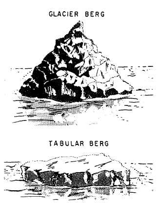 Figure 1-1-7.-Types of icebergs. to 450 meters in length when first formed. The largest ones may exceed 120 meters in height and several miles in length. The tabular bergs of Antarctica average 30 to 40 meters in height, but their horizontal dimensions greatly surpass those bergs of the Northern Hemisphere. For example, one iceberg observed near Scott Island in 1956 measured 60 miles by 208 miles.The portion of an iceberg that is visible above the water is dependent upon the type of the berg and the density differences between the seawater and the ice. The type of berg (pinnacle or tabular) determines the height of the ice above the water. In the case of the tabular berg, the depth below the surface is about seven times the height above the water line. In the case of the pinnacle or irregular berg, the depth below the surface averages about five times that above the water line.With regard to density, seawater with a temperature of 1C and a salinity of 35 produces a density condition that allows for nearly 90 percent of the ice to be submerged. Irregular icebergs often have rams (protrusions of ice beneath the surface). These rams can be a great hazard to vessels that might pass close by these type bergs.Drift. While the general direction of the drift of icebergs over a long period of time is known, it may not be possible to predict the drift of an individual berg at a given place and time, for bergs lying close together have been observed to move in different directions. The reason for this is that icebergs move under the influence of the prevail-ing current at the icebergs submerged depth. This subsurface current often opposes the existing wind and sea or surface drift.BERGY BITS AND GROWLERS. Like icebergs, bergy bits and growlers originate from glaciers and form when icebergs and other masses of land ice disintegrate. A bergy bit is a medium sized fragment of glacier ice and is about the size of a small cottage. A growler is a small frag-ment of ice about the size of a grand piano. It is usually of glacial origin, and generally greenish in color.SUMMARY The surface of the sea varies much like that of the land. It can be smooth, rough or ice covered. Its state is governed to a great extent by the atmosphere with which it interfaces. The wind is the primary controller of the sea state (wave action) and the circulation pattern within the oceans (the major ocean currents). The air and seawater temperature differences control the evaporation and condensation processes, while the air temperatures control the formation of sea ice to a large extent.