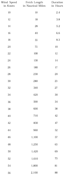 are at their maximum height and are FULLY DEVELOPED for the prevailing wind speed. As an example, if over a calm (no wind) 60-nautical-mile stretch of ocean a 20-knot southwesterly wind develops, the water ripples and then small wavelets develop. Eventually, all the energy of the 20-knot wind is imparted to the sea, and the waves become fully developed. Table 1-1-1 shows the wind-sea relationship for fully developed seas. For a 20-knot wind, it takes a minimum of 10 hours for a fully developed sea of 5- to 10-foot waves to develop.When the wind is unable to impart its maximum energy to the waves, the sea does not fully develop. This can happen under two circumstances: (1) when the distance over which the wind blows is limited (the fetch is not long enough); or (2) when the wind is not in contact with the sea for a sufficient length of time (the wind hasnt been blowing long enough).FETCH-LIMITED SEA. When the fetch length is too short, the wind is not in contact with the waves over a distance sufficient to impart the maximum energy to the waves. The ranges of wave frequencies and heights are therefore limited. The wave frequencies are smaller and the wave heights are less than those of a fully developed sea. The wave generation process is cutoff before the maximum energy can be imparted to the waves and the fetch reaches a steady state. Therefore, for every wind speed, a minimum fetch distance is required for the waves to become fully developed. If this minimum fetch requirement is not met, the sea is fetch limited.DURATION-LIMITED SEA. When the wind is in contact with the sea for too short a period of time, it doesnt have enough time to impart the maximum energy to the sea. Any increase in wave frequencies and heights ceases before a fully developed state-of-the-sea com-mences. When this occurs, the sea is duration (time) limited. Therefore, every wind speed requires a minimum time for waves to become fully developed. If this time requirement not met, the sea is duration limited. The state-of-the-sea classifications are as follows: fully developed, fetch limited, and duration limited. Table 1-1-2 shows the minimum wind durations and fetch lengths needed to generateTable 1-1-2.-Wind Speed and Minimum Fetch Length and Duration Necessary for a Fully Developed Sea