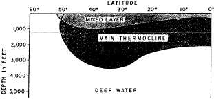 Figure 1-2-1.North-south distribution of a simple three-layered ocean (North Atlantic) in winter.thermal structure is shown in figure 1-2-2. Both figures are representative of winter.Mixed Layer The mixed layer is the upper layer of the three-layered ocean model. It is a layer of fairly constant warm temperatures which, in middle latitudes, extends from the surface to a maximum depth of about 450 meters, or 1,500 feet. This layer gets its name from the mixing processes that bring about its fairly constant warm temperatures. The two mixing processes are classified as mechanical and convective.MECHANICAL MIXING. This mixing process is caused by wave action, surface storms, etc. The wave action stirs up the water. Warmer surface water is driven downward, where it mixes with colder subsurface water. Eventually, a layer of water with a fairly constant temperature is produced. This process is more important in summer than in winter, because surface waters are much warmer and less dense than sub-surface waters, thereby producing a stable water column. The mechanical mixing process is more rapid and irregular than the convective mixing process.