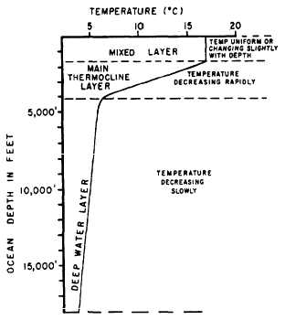 THE THREE-LAYERED OCEAN A convenient method of visualizing the sea is to divide it into layers in much the same way that we do the atmosphere. Using bathythermograph information (temperature versus depth profiles), the oceans display a basic three-layered structure: the mixed layer, main thermocline, and deep water layer. The latitudinal distribution of these layers is shown in figure 1-2-1, while the typical