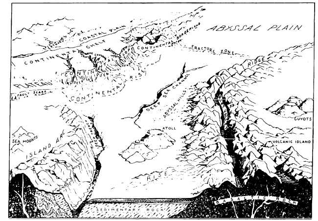 Figure 1-3-1.-The five major bottom provinces. its seaward limit. the water above the shelf is usually 60 to 100 fathoms deep (1 fathom = 6 feet). Although the average slope of the shelf is gradual, terraces, ridges, hills, depressions, and deep canyons are found within its boundaries. The shelf region is a transition zone between freshwater runoff from land and the more saline water of the sea; consequently, it is an area of great mixing of water with generally unstable water conditions. Currents normally run parallel to the shore in this region.Continental Slope At the seaward edge of the continental shelf the slope becomes much steeper. This region is known as the shelf break. The drop off is rapid. On the average, the slant ratio is roughly 20 times greater than that of the continental shelf. The ratio is generally much greater off mountainous coasts than off wide, well-drained plains. On bottom contour charts (figure 1-3-2), the bottom contours are tightly packed, thereby reflecting the much steeper gradient.The continental slope resembles a steep cliff that has been eroded by heavy rains. Its most striking features are the submarine canyons, deep cuts or scars, that are prevalent along the slope face. These canyons are thought to have been formed (or cut out) by turbidity currents, which are dense, sediment-laden currents that flow along the ocean floor. Some of these canyons are equal in size to the Grand Canyon. At the seaward end of these canyons, large amounts of sediment are deposited and spread out in a fan-like manner to form the continental rise. Refer to figure 1-3-1 again.Continental Rise The continental rise is found seaward of the continental slope, in approximately 500 fathoms of water. It is made up of thick sediment deposits that cover irregular relief features. These deposits slope gently seaward forming the abyssal plains of the deep ocean basins. At the seaward edge of