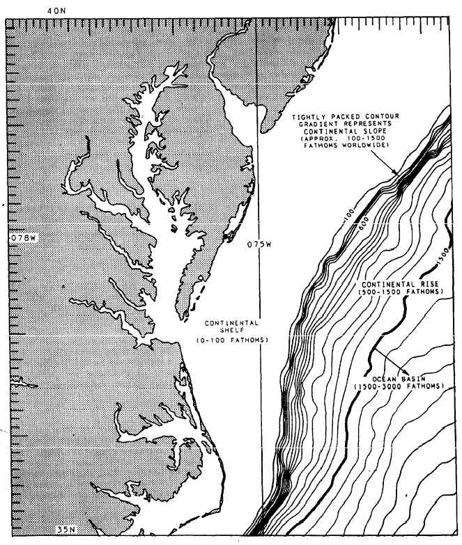 Figure 1-3-2.-Bottom contour chart. the continental rise, the water depth is about 1,500 fathoms.