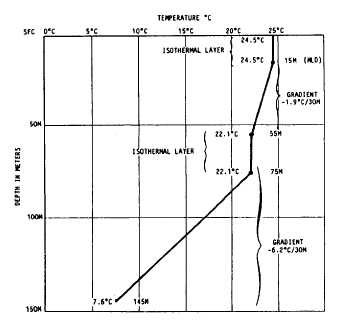 Figure 1-4-5.-Mixed-layer depth (MLD) determined using BT analysis. reported depth of 145 meters the temperature drops rapidly to 7.6C. The first reported depth with a temperature at least 1C colder than the surface temperature is 55 meters. The preceding temperature is 24.5C at 15 meters. This is the depth of the mixed layer. Had the isothermal layer at the surface not been in existence and the temperature had simply decreased from the surface to 55 meters, the MLD would have been at the surface. In other words, there would have been no mixed layer.The importance of the mixed layer lies in the fact that it is most often synonymous with the sonic layer and plays a vital role in ASW operations. The mixed layer also plays a key role in the food chain. Some of the most productive fishing areas are found where strong mechanical and/or convective mixing occur.Sonic Layer The sonic layer depth (SLD) can also be deter-mined from temperature-versus-depth profiles. The depth where the warmest temperature occurs is normally the SLD, but not always. The speed of sound in water is normally greatest near the surface, where the temperature is warmest, and decreases with depth as the temperature decreases. However, at greater depths, sound speed increases because pressure becomes the dominant controlling factor. Figure 1-4-6 is a BT profile that shows the MLD and SLD at different depths. The SST is 24.5C, and the temperature increases to 26.0C at 10 meters. The temperature then decreases gradually to 25.1C at 28 meters before falling rapidly to 15.6C at 80 meters. The MLD in this example is at 28 meters, while the SLD is at 10 meters. The SLD is at 10 meters because this is the level with the highest temperature.