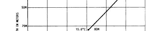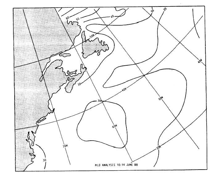 Figure 1-4-7.-Example of a MLD chart. A (+) denotes the reported value is or may be greater than that indicated. A (p) is plotted if a positive temperature gradient exists from the surface to the MLD. If both a positive gradient and a possibly deeper layer depth exists, the and (+) are both plotted.Analysis Procedure The mixed layer is analyzed by drawing isopleths of equal layer depth. Like isobars, these lines should be smooth flowing and never cross or touch. Unlike isobars, there will be no sharp turns or kinks. Isopleths are drawn at 60-meter intervals in winter and 15-meter intervals in summer. In winter, the mixed layer extends to much greater depths than in summer; therefore, the 60-foot interval is used. In summer, the mixed layer is much shallower and the 15-meter interval is required.As you might expect, there are even less bathythermograph observations to work with than there are SST observations. Therefore, past history is extremely important. I recommend that you place the last analysis under the current plotted chart and do the current analysis on a light table. If a light table is not available, use a yellow pencil and transpose as many of the historical isopleths as necessary onto the current chart. Another aid in regions with few or no layer-depth observations is the latest SST analysis. The SST analysis is used to determine the SST advection pattern, which in turn is used to evaluate reported layer depths and to justify increasing or decreasing layer depths in a region. factor, the vertical temperature gradients, controls the sound ray paths.