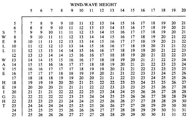 Rogue or Freak Waves Rogue or Freak waves get their name from their height, which is abnormally high compared to the sea heights observed prior to the occurrence of this type of wave. The USS Shreveports bow and crashed into the superstructure at bridge level. It knocked out every window in the bridge, and men and equip-ment were battered. Prior to meeting this freak wave, the seas were normal, based on the wind conditions at the time. Such abnormal waves are highly infrequent and totally unpredictable.Oceanographers are not sure what causes these waves, but based on studies of encounters such as that of the USS Shreveport, oceanographers have found that these waves occur most frequently in areas of strong sea-surface temperature gradients. Such gradients exist where cold and warm sea currents meet. One such area is the "North Wall" of the Gulf Stream, off Cape Hatteras. Another area exists along the coast ofTable 1-1-3.-Combined Sea-height Table