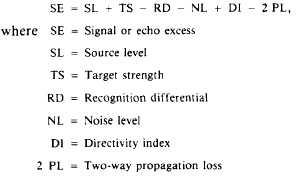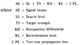 SIGNAL EXCESS. Signal excess is the amount of sound energy received from a target over and above the amount required to detect it. Signal excess is based on probability conditions. When the signal excess is zero, the probability of target detection is considered to be roughly 50%. Signal excess, like all of the other factors of the equation, is expressed in decibels.SOURCE LEVEL. Source level of the sonar projector pertains to the intensity of the radiated sound, in decibels, relative to a reference intensity. Source level is controlled by the design, maintenance, and mode of operation of a sonar. |