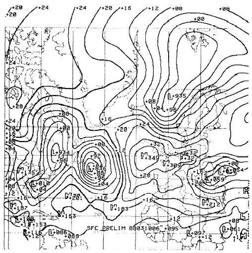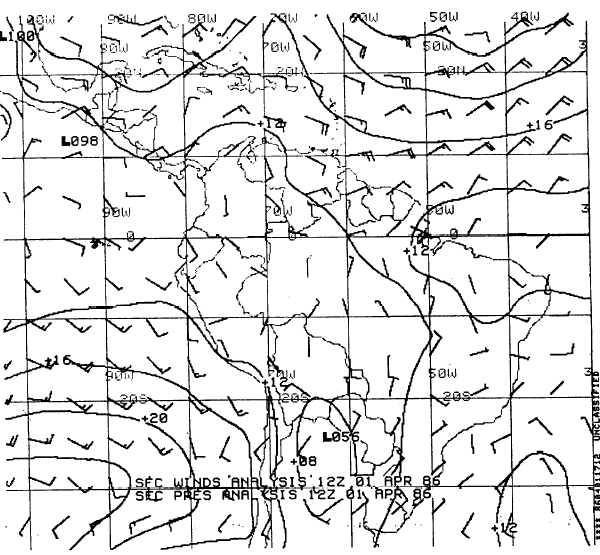Figure 4-2-1.-Surface preliminary analysis. indicated by a "+" mark. The central pressure is printed to the right of the "+" mark in tens, units, and tenths of millibars. Shortly after the SFC PRELIM is produced, the computers complete the more detailed surface is typical of charts produced for users in the tropics. Note the smaller scale; this chart covers only about one-fifteenth of the globe. The isobars are drawn every 4 millibars. They show a much more detailed representation of the pressure pattern than is shown in the SFC PRELIM analysis, although smoothing may eliminate minor, yet significant pressure deviations. Winds are represented on this chart by standard wind plots on a five-degree grid. They do not represent actual reported winds, but computer-averaged winds over a five-degree-square area. Neither of the FNOC surface analyses depicts fronts or troughs.