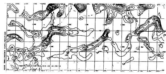 Figure 4-2-3.-Frontal depiction analysis. may notice that the same grid spacing is equivalent to about 7 degrees latitude at 50N, or about 420 nmi. This means that at 15N the wind plot represents an average wind for a 90,000-square-mile area, while at 50N the wind plot represents an average wind for a 176,400-square-mile area, or about one-half the resolution. You must keep that in mind when using these charts to make your forecast. Sometimes it is preferable to use a geostrophic wind scale and isobar spacing to determine forecast winds, instead of the winds plotted on the chart. Learning Objective: Interpret FNOC constant-pressure and freezing-level charts. |