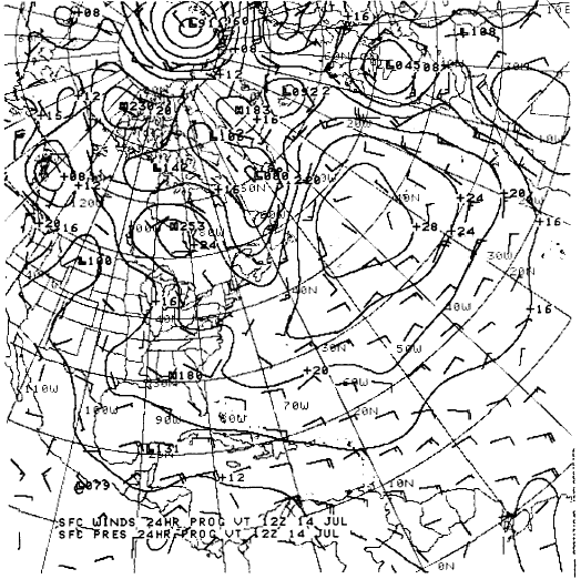 Figure 4-2-4.-Surface-wind and surface-pressure prognosis. 300-, and 200-millibar levels. Figure 4-2-5 shows an 850-millibar analysis on a polar stereographic map projection as used in the mid-latitudes. Figure 4-2-6 shows a 500-millibar, 48-hour prog-nosis. Except for the chart identification and contour labeling, these charts are very similar. The winds, temperature, and height prognosis data fields are usually combined on a single chart for each of the various constant-pressure surfaces. Winds are represented with standard plots; height contours (isoheights), by solid lines; and temperature (isotherms), by dashed lines. All charts use a 5C isotherm interval, with the temperatures labeled in degrees Celsius. The 850-millibar chart uses a 30-meter isoheight interval; the 700- and 500-millibar charts use a 60-meter isoheight interval; and the 400-, 300-, and 200-millibar charts use a 120-meter