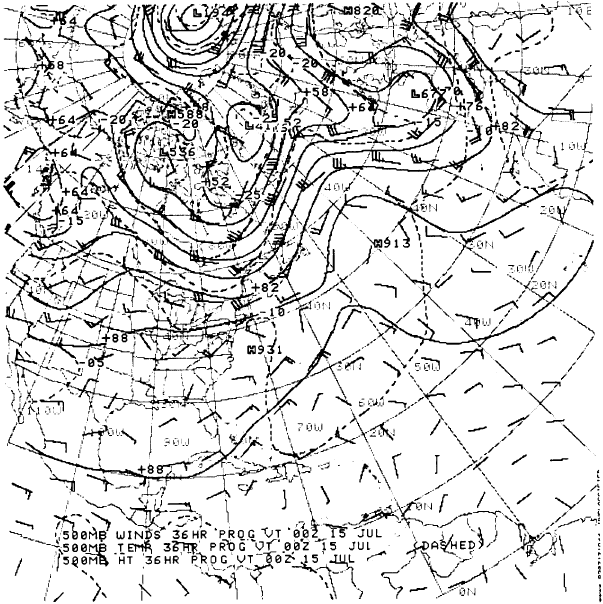 Figure 4-2-6.-500-millibar prognosis. isoheight interval. While the 500-millibar level is routinely available in 12-hour increments out to 120 hours, and the other levels are routinely available in 12-hour increments out to 72 hours, the charts transmitted on the Fleet Facsimile broadcasts are usually limited fore-to the 24- and 48-hour forecasts. Generally, products distributed to the fleet are tailored by the NOC centers. |