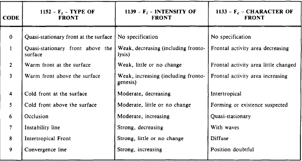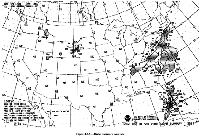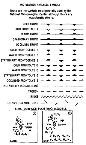 Figure 4-3-3.-NMC weather analysis symbols. Visual Flight Rules (VFR) condition areas prevail in all other areas not surrounded by solid lines. These are areas where the ceilings are greater than 3,000 feet and the visibility is greater than 5 statute miles. Surface frontal positions from the previous hour are drawn using the standard NMC depictions. Plotted data for each terminal includes (1) significant weather symbols; (2) visibil-ity, in statute miles; (3) total sky cover, in tenths; and (4) ceiling height. All ceiling heights of the lowest layer with 5/10 or greater coverage are plotted. When total sky cover is less than 5/10, the height of the lowest scattered layer is plotted. Visibilities over 6 statute miles are not plotted. Date and time of the analysis are found in the identification block in the lower left corner of each chart.