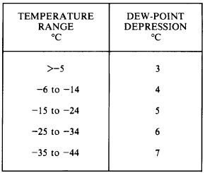 The different parameters shown on these charts are as follows: Isoheight contours are shown by solid lines. Table 4-3-2 shows the approximate height of each chart, the base height of the isoheight lines, and the standard contour spacing of the isoheight lines. Each isoheight and height center are labeled in thousands, hundreds, and tens of meters. Although troughs and ridges are shown by the isoheight contours, the placement of axis lines for these features is left to the user. Since the computer draws smooth isoheight contours, reanalysis of the contours may help locate the axis of troughs, especially short-wave troughs. This, of course, is not possible on the charts that do not display the plotted data. (Review AG2, Volume 1, Unit 8, Lessons 2 and 3, if necessary for relative information.) Isotherms, or lines of equal temperature, are shown every 5C by dashed lines and labeled with the temperature. The computer tends to over-smooth the isotherms. Reanalysis of isotherms sometimes shows isotherm troughs much better than the computer analysis. This is important when attempting to identify short waves in the isoheight analysis. Isoheight troughs are usually associated with isotherm troughs, although the isotherm and isoheight trough axes may not necessarily coincide. High and low height centers are indicated by Hs and Ls respectively, and are labeled with three digits to indicate the central height. Table 4-3-3.-Significant Moisture on Constant Pressure Charts Based on a 3C Frost Point Depression