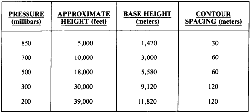 Plotted data on the North American charts is depicted on the charts according to the plotting models in figure 4-3-7. Station circles are filled in when the dew-point depression is equal to or less than 5C. Reanalysis of significant moisture at the standard levels should be done by criteria in table 4-3-3 to depict where significant moisture exists (enough moisture to form broken to over-cast cloud cover). Isotachs, or lines of equal wind speed, are shown as dashed lines at 20-knot intervals on both the 300- and 200-millibar charts, with areas of wind speeds 50 to 110 knots being shaded. Further analysis should be done to find the jet-stream axis Table 4-3-2.-Isoheights on Constant Pressure Charts