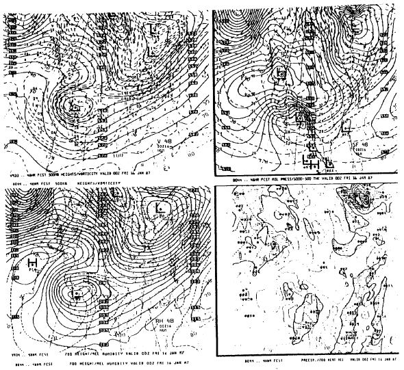 Figure 4-3-13.-NGM prognosis chart. to the height contours, is an area of positive Typically, these areas are shaded in red pencil. Positive vorticity advection shows a tendency for the air to increase its up-ward velocity. This means that clouds will tend to form or become thicker and that precipitation will tend to begin or become heavier/more wide-spread. Any area on the downwind side of a vorticity trough, where the vorticity pattern is not parallel to the isoheights, is an area of negative vorticity to dissipate cloudiness. Vorticity ridges, sometimes called vorticity maxima lobes, tend to overlie short-wave troughs, These may be more evident on the lower level 700-millibar isoheight forecast as height troughs or on the surface forecast as a pressure trough (frontal or non-frontal). MEAN SEA LEVEL PRESSURE AND 1,000-TO-500-MILLIBAR THICKNESS FORE-CAST. Isobars are drawn with solid lines every 4 millibars and labeled in tens and units of millibars. Surface high-pressure centers are labeled with an H, and low centers with an L. An X within a circle indicates the exact forecast center position. The 1,000-to-500-millibar-layer thickness is indicated with dashed lines every 60 meters and is labeled in decameters. Thickness contours and isobar patterns should greatly assist you in your determination of frontal placement on these forecast charts. Thickness lines are closer together (packed) on the cold-air side of warm and cold fronts, which lie in the troughs of low pressure. Slight bends in the thickness pattern can indicate a pressure trough or a very weak frontal system. A large bulge in the thickness pattern either parallel to the surface isobars or toward lower pressure usually indicates an occlusion. 700-MILLIBAR HEIGHTS AND RELA-TIVE HUMIDITY. On this panel, the 700-millibar isoheights are drawn in solid lines every 30 meters and are labeled in decimeters. High and low height centers are labeled in decimeters as well. The average surface-to-500- millibar relative humidity values are drawn in dashed lines from 10 to 90 percent. Values greater than 70 percent are shaded. Short-wave determination is best done on this chart, using the vorticity forecast as a guide. 700-MILLIBAR VERTICAL VELOCITY AND PRECIPITATION. On this panel, the thin solid lines indicate vertical velocity, or the upward/downward movement within a column of air. Isopleths are drawn every 3 microbars per second, and labeled in microbars. A positive value means the air is rising, while a negative value means the air is sinking. A microbar is a unit of pressure (0.001 millibar). A 3-microbar-per-second vertical velocity equates roughly to air rising at 0.11 feet per second (near 700 millibars). The bold solid lines indicate forecast precipita-tion accumulations for the 12-hour period ending at the forecast time (valid time) of the chart. Although these lines are not labeled, they are drawn at 1/2-inch intervals starting at a trace. The area between alternate contours is shaded so that shading represents accumulated precipitation from a trace to 1/2 inch, 1 inch to 1 1/2 inches, 2 to 2 1/2 inches, etc. Additionally, relative precipitation maximum centers are identified with an X within a circle and are labeled in hundredths of an inch. Precipitation amount is the only time-phased parameter on the NGM chart series. |