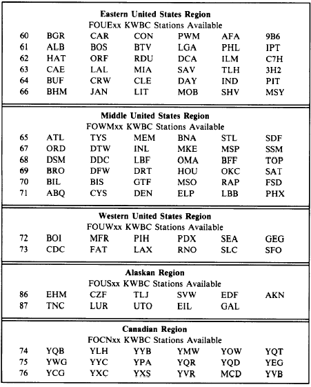 R1 is the mean relative humidity in the lowest level of the NGM modelthe boundary layer. Since the top of the boundary layer is 35 millibars above the surface, this value is the relative humidity in the layer from the surface to roughly 1,000 feet AGL. In our example, 63 is 63 percent relative humidity. R2 is the mean relative humidity in layers 2 through 9 of the NGM model. This equates to the layer from the boundary layer up to 480 millibars, or roughly 19,000 feet AGL. Example: 72 means the relative humidity in layers 2 through R3 is the mean relative humidity in layers 10 through 13 of the NGM model. This equates to the 480-millibar level through the 180-millibar level, or roughly 19,000 feet to 41,000 feet. Example: 23 is 23 percent. VVV is the instantaneous vertical velocity in microbars per second at the 700-millibar level. Negative vertical velocities, or movement of air downward, are prefixed with a minus sign. Example: 009 in this case is 9 microbars per second (upward) vertical velocity. LI is the Lifted Index in degrees Celsius. Negative LI values are subtracted from 100. Example: 15 is 15C, but a 95 would mean the Lifted Index is 05C. PS is the sea level pressure in tens and units of millibars. Example: 07 is 1,007 millibars. DD is the wind direction in hundreds and tens of degrees at the boundary level, or about 986 feet above the surface. Example: 25 means the wind is from 250 true. FF is the wind speed in knots at the boundary level, or about 986 feet above the surface. Example: 20 means the wind speed is 20 knots. HH is the 1,000-to-500-millibar thickness in tens and units of decimeters. The hundreds digit (5) is omitted. Example: 34 means the meters. T1 is the mean temperature in degrees Celsius through the boundary layer. In practice, this may be used as the forecast temperature for 17 millibars (roughly 480 feet) above the surface, which is usually rounded off to 500 feet AGL. Temperatures cooler than 0C are subtracted from 100. Example: 98 means that the 500 foot temperature is 2C. T3 is the mean temperature through layer 3 of the NGM model in degrees Celsius. This layer extends from 78 to 138 millibars above the surface, or roughly from 2,240 feet to 3,925 feet AGL. In practice, this is used as an approximate temperature for the 3,000-foot AGL level. Temperatures below freezing are subtracted from 100. Example: 95 means the 3,000-foot temperature is 5C. T5 is the mean temperature in degrees Celsius through layer 5 of the NGM, which extends from about 194 to 255 millibars above the surface, or essentially from about 5,836 to 7,906 feet AGL. In practice, the mean temperature of layer 5 (T5) is used as the temperature at 7,000 feet AGL. Temperatures below freezing are subtracted from 100. 95 means the 7,000 foot temperature is 5C. |