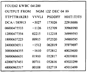 The arrangement of the data and the type of data, in some cases, is also slightly different from the LFM forecast bulletin. Table 4-3-7 is the first data block from a typical NGM forecast bulletin with the MANOP and identification lines. A second stations block of data would be printed to the right of this data block, so the actual bulletin would be formatted in two columns of station data, similar to the LFM bulletin. The MANOP and identification lines are similar to the LFM bulletin, which was described in the last section. Line 3 gives the coded format of the data columns, which is different from the LFM bulletin. Line 4, which begins with the three-letter station identifier, contains information from the analysis. Lines 5 through 12 are the forecast data. Each line begins with the number of hours after the analysis, in 6-hour increments, for which the forecast is valid, just as with the LFM format. In the following explanation, we will use line 7, the 18-hour forecast, as an example to clarify the breakdown of the information contained in the data columns and identified in line 3 by the coded format.TT is the time in hours from the analysis time that the forecast is valid. In line 7, the 18 is 18 hours after 1200Z 4 December, or 0600Z 5 December. PTT is the 6-hour accumulated precipita-tion (ending at the forecast time) in hundredths of an inch. In our example, 000 means no 6-hour period ending at 0600Z. Table 4-3-7.-A Data Block From a Typical NGM Forecast Bulletin With MANOP and Identification Lines