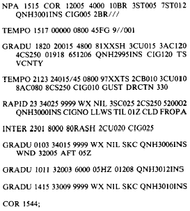 TEMPO GGGeGe is the change group used to indicate temporary changes in a prevailing forecast condition. Each change from the predominant condition should last less than 1 hour, and if the change is to occur more than once, the total time of all the occurrences should not exceed one-half the total time covered by the forecast period indicated by GGGeGe When using this group, it is followed only by the description of the elements that are forecast to be different from the predominant conditions during the period. It should not include a QNH group, but may include any pertinent remarks. GGGeGe is the forecast period indicator. GG is the last whole hour UTC before any change GeGe is forecast to occur, and is the first whole hour UTC after the changes end. The period must cover the entire time during which the conditions will be different from the forecast prevailing conditions. INTER GGGeGe is the change group used to indicate intermittent changes from a pre-dominant forecast condition. Intermittent changes occur more frequently than temporary changes and last for shorter periods of time. All occurrences together must last less than half the total time covered by the forecast period. This group is followed by a description of only those conditions that will be different from the prevail-ing conditions, including ceiling designation and pertinent remarks. At this point, you should be able to read a TAF coded report. An example of a TAF for NAS Pensacola (Sherman Field) is provided along with an explanation of the coded forecast. As you go through the coded forecast, determine what each code group actually means. Compare your interpretation with the explanation.