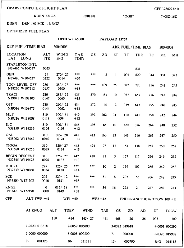 The next line states that the CFP is an optimized fuel plan, meaning that it is based on the best route and altitudes to save fuel. The next two lines are actually part of the aircraft fuel and weight summary, which is continued after the en route data section. We will cover those a little later.Table 4-6-1.-MAC Format OPARS CFP Example