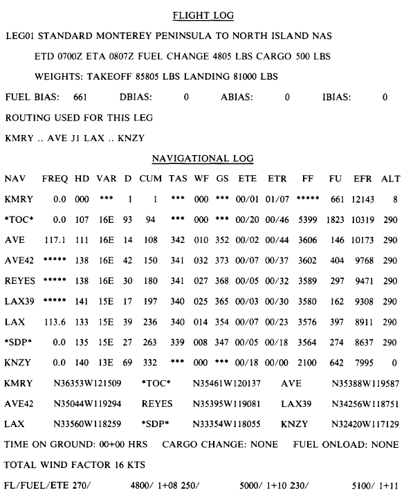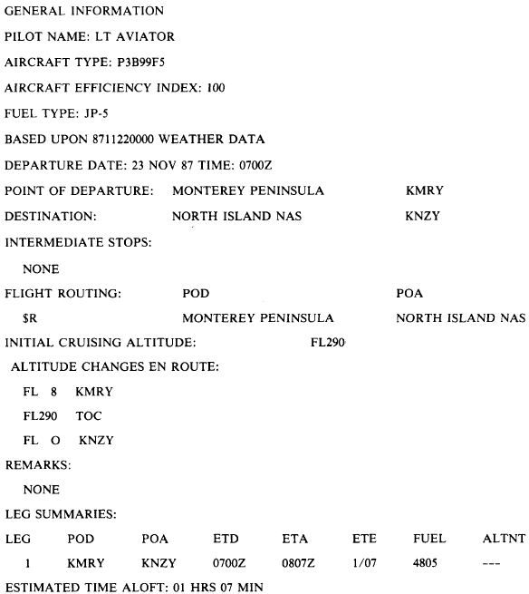 The only information in this section that may need explanation is some of the abbreviations used:$R under the Flight Routing title means on and off standard jetroutes. The flight will follow standard jetroutes only if they are near the best fuel-savings route. POD is point of departure. POA is point of arrival. TOC is top of climb. ETD is estimated time of departure. ETA is estimated time of arrival. ETE usually means estimated time en route between the points specified, so in this case (the two specified points are POD and POA), it section repeats this information in plain language. ALTNT is the alternate airfield selected by the requester for the destination airfield. In the Flight Log section, the leg number, departure point, destination, and departure and arrival times are given, along with weight and fuel information. The last line of data in this section is the routing summary. The flight identification information we have just covered includes, at a minimum, basic information to identify the aircraft type, time and place of departure, destination, cruising flight level, and a routing summary.Learning Objective: Interpret the aircraft fuel/time/weight summary data. |