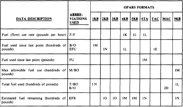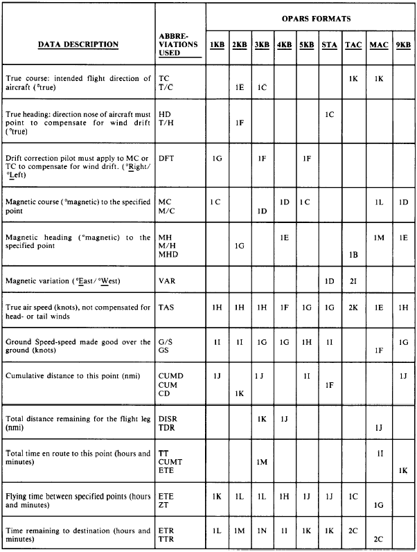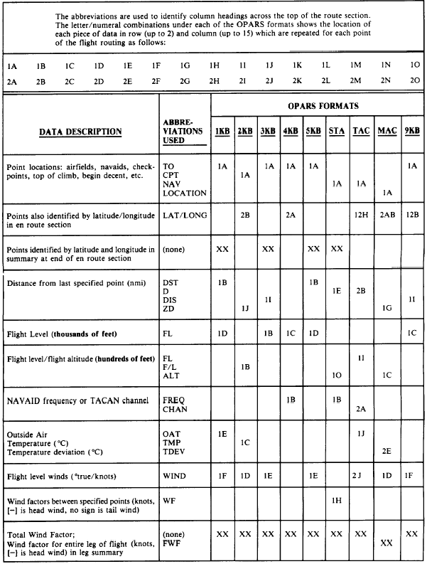 EN ROUTE DATA The last type of data that the OPARS CFPs contain is en route data. In the majority of the formats, en route data consists of (1) a section of point locations and associated information at these points in the flight, which we will call en abbreviations with an explanation, flight profile and (4) a total windfactor for the flight. En route Point Details Look again at figure 4-6-1, at the section identified as en route data. The en route point details begin with one or two lines of en route point locations, with associated navigation information, flight times and distances, and fuel usage information. The data contained in the columns in each line is identified with an abbrevia-tion at the top of each column. The one or two lines of data are repeated for each point used in the routing. This section of the en route data which provides specified points and associated information is used in all of the CFP formats except the Abbreviated format, which does not contain any specific point data, and the How-goes-it format, which provides a graph of the en route location identifiers plotted on a scale of Fuel remaining in the aircrafts tanks (in pounds) versus nautical miles traveled. The specific information that is included in each formats en route point details section differs slightly, and is identified in table 4-6-3. Generally, this section of the en route data identifies specific points along the intended flight route, and provides specific air-craft performance information at those points.In the Standard format this information is contained in the section called the Navigational Log.The en route point details section of the Tactical format is very similar to the Kneeboard, Standard, and Military Airlift Command formats except blanks are left in the lines of data for pilot/navigator-entered comments, such as under the headings ATA (for actual time of arrival at the location), AFU (for actual fuel use to the point), and AFR (for actual fuel remaining).Latitude/Longitude Listing The CFP formats that do not provide latitude and longitude with each navigation point within the data lines of the en route point details section will provide a listing of the specific en route point identifiers and the associated latitude/longitude. Table 4-6-3.-Data Presented in the En Route Point Details Section of the Various OPARS Formats