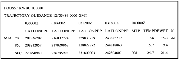 NGM MOS Forecast Bulletins The NGM MOS guidance bulletins, or the NGM Perfect Prog Forecasts, were first issued shortly after the April 1987 Technical Procedure only the stations three-letter identifier. The second is a POP/MN-MX line with forecasts of 12-hour probability of precipitation forecasts followed by a forecast maximum or minimum temperature. The third line is a WIND forecast identical to the LFM MOS wind forecast, and the last line is a CLDS forecast identical to the LFM MOS forecast. These bulletins are available under the MANOP series beginning with FOUS14 complete format should be very similar to the LFM MOS as well. At present, in situations when the NGM charts and forecast guidance are followed, the NGM MOS bulletins should serve as the primary forecasting aid for the informa-tion that is covered. Trajectory Bulletins The trajectory bulletins provide 24-hour forecasts for parcels of air in the lower atmosphere. The objective of these forecasts is to provide greater accuracy and detail in the forecasting of moisture distributions below 700 millibars. These forecasts trace the paths of parcels of air that are expected to end up over the forecast station at the 24-hour forecast time. Table 4-3-10 shows a typical trajectory bulletin forecast for a single station. The first and second lines in the bulletin provide the MANOP header and product identification, as well as the date-time group. The third line in the bulletin gives the forecast times, with the first time being the actual analysis time. The fourth line is the headers for each block of data. The fifth line contains the station identifier and the 700-millibar data, while the sixth line contains the 850-millibar data. The last line provides surface information. The data represented in the columns are the following. The examples given are for the 700-millibar line, under the 030000Z analysis data column. LAT is the north latitude of the parcel of air at the specified time, to the nearest tenth of a degree. In our example, the parcel of air forecast to be over Miami at 040000Z was at 207, or 20.7N latitude at the 030000Z analysis time. LON is the west longitude, to the nearest tenth of a degree, of the parcel of air at the time specified. The hundreds unit is dropped for longitudes greater than 100. The 700-millibar air parcel over Miami at the 040000Z forecast time was at 836, or 83.6W longitude at the 030000Z analysis time. PPP is the parcels pressure, in millibars, at the time specified. The thousands unit is dropped for pressures over 1,000 millibars. The parcel of air at 700 millibars over Miami at the 040000Z forecast time was at 702, or 702 millibars at the 030000Z analysis time. This same data format is followed for all three levels for the analysis time, as well as for the 6-, 12-, and 18-hour forecast times. The data in the 24-hour forecast column is different. The elements presented in that column are the MTP, TEMP, DEWPT, and K.MTP is the model terrain pressure, or the forecast surface pressure (station pressure) at the station for the forecast time (040000Z). 008 means millibars. TEMP is the temperature of the air parcel in degrees Celsius at the forecast time. 7.6 means the 700-millibar temperature will be 7.6C at the forecast time. DEWPT is the dew-point temperature of the parcel of air in degrees Celsius at the forecast time. 5.3 means the dew-point temperature at 700 millibars will be 5.3C at the forecast time. K is the forecast K-Index. (See Unit 6, Lesson 2.) Following the trajectory paths not only will allow you to see where the air over your stationTable 4-3-10.-An Example of a Typical Stations Data From a Trajectory Bulletin