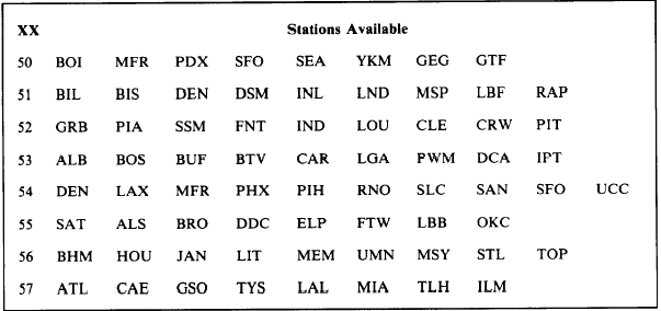 at the forecast time originated, but it will allow you to determine vertical velocities. For instance, the 700-millibar parcel originated at 702 millibars at 030000Z, and 6 hours later will have a pressure of 724 millibars. This implies a net downward vertical motion of 22 millibars per 6 hours. Some of the best uses of trajectory data is to forecast the changes on a Skew T, Log P MANOP for your location.SUMMARY In this lesson we have discussed some of the charts and products used daily by Navy Aerographers Mates. We have addressed the minimum knowledge you must have in order to perform your day-to-day duties. You can acquire additional information by reading or reviewing some of the sources cited in this lesson. In time, through the continued use of the charts and products we have discussed, you will acquire the skill to "read" the charts and products as easily as you read a book. This skill can only be obtained through practice. As an exercise, in your weather briefing area, have your Chief, LPO, or Section Leader help you to locate some of the charts and products we have discussed. Interpret as much information as you can from each of the charts or bulletins. Your Chief or LPO will assist you with any difficulties in interpretation. Discuss your interpretation with them to ensure you are interpreting the information correctly.Table 4-3-11.-Trajectory Bulletin Regions and Available Stations With the MANOP FOUSxx KWBC