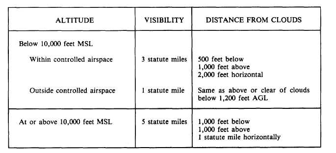 Visual Flight Rules Visibility and cloud clearance minimums for VFR flights are dependent on whether the flight is within or outside controlled airspace. Con-trolled airspaces are those areas in which some or all aircraft may be subject to air traffic control. Figure 5-2-3 lists the basic VFR minimums applicable to flights within or outside controlled airspace. Additional VFR weather minimums are as follows:1. At an airfield of departure, within the "control zone" the distance between the surface and the lowest "broken" or "over-cast" cloud layer (ceiling) must be at least 1,000 feet. However, some airfields require that the ceiling be greater than 1,000 feet. At those airfields requiring a higher ceiling, pilots are cleared using the higher, more stringent minimum. The DOD Flight Information Publication (IFR Supplement) lists IFR ceiling requirements in the remarks section on each airfield.NOTE A control zone" normally refers to a circular area around an airport (5-mile radius) and any extensions necessary to in elude instrument approach and departure paths.