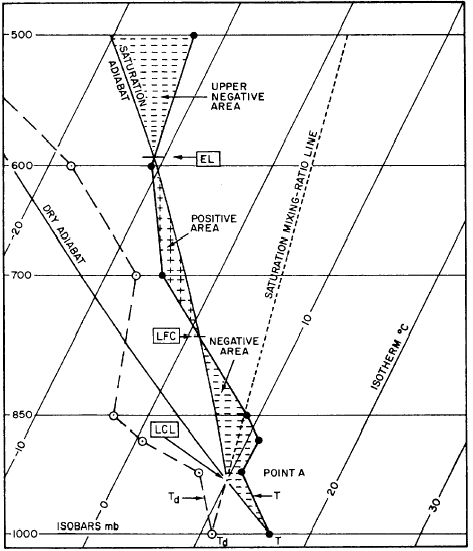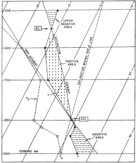 Figure 6-2-11.-Positive energy areas and negative energy areas (convective). Refer to figure 6-2-11 to determine positive and negative energy areas pertaining to CONVECTIVE LIFTING. The procedure used in determining these areas is as follows: 1. Find CCL (moist-layer and/or parcel method). 2. From CCL, draw a line to the top of the chart paralleling the nearest saturation adiabat. 3. Draw a line from CCL to the surface paralleling the nearest dry adiabat. 4. Using a red pencil, shade in any area bounded by the temperature curve on the left and the drawn saturation adiabat on the right. These areas are the POSITIVE energy areas. 5. Using a blue pencil, shade in any area bounded by the temperature curve on the right and the drawn saturation adiabat on the left. These areas are the NEGATIVE energy areas. Refer to figure 6-2-12 to determine positive energy areas and negative energy areas that pertain to MECHANICAL LIFTING. The procedure for determining these areas is as follows: 1. Determine LFC. 2. From LFC, extend the saturation adiabat to the top of the chart.