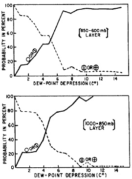 CLOUD LAYER CRITERIA The Skew T gives you, the analyst, the best information to evaluate where cloud layers are and the type of cloud in each layer (short of sending an observer up in an aircraft). Analysis of moisture and winds can help you identify cloud layers missed by your observer at night or hidden by a low overcast. In this section we will see how to identify cloud layers by their moisture content and how you can identify the cloud type. We will also look at the association between cloud temperatures and precipitation, and some limita-tions in the identification of the taller cumuloform and cirriform clouds.Cloud Layer Analysis Studies have shown that water vapor becomes visible, as either minute water droplets or ice crystals, well below the saturation point. Other studies have correlated radiosonde observed temperatures and moisture measurements with aircraft observed cloud layers. While most aircraft reported cloud layers were supported by raob data, many thin or scattered cloud layers reported by aircraft often were not evident in the raobs. This was often interpreted as an accepted deficiency due to the lack of sensitivity of the older hygristors in the radiosondes. Nevertheless, the studies did find definite relationships between observed relative humidities and cloud layers.Figure 6-2-13 shows the relationship between the dew point depression and cloud coverage that was determined by the study. Note that these results relate the dew point depression to the probability of occurrence of a scattered or overcast cloud layer. This study and other similar studies provided the basis for the following rules, which are used to analyze cloud layers on a Skew T.A cloud base maybe inferred to be located where the dew point depression decreases to 5C or less when the air temperature is above freezing, or where the frost point depression is 5C or less when the air temperature is below freezing. This is especially true if the dew point or frost point depression shows a sudden decrease near the same level. Dew point depressions in a cloud, on the average, are greater at cooler temperatures Use point depression of 4C at 10C, 5C at 20C, 6C at 30C, etc.). *A part of the difference is due to deficiencies in the hygristor circuitry of the radiosondes. This discrepancy may be reduced somewhat using the Vaisala Mini Sonde. Manufacturers data indicates that the Humicap humidity element has a much greater sensitivity and less lag time than the hygristor of the widely used Viz J005/J006 sondes and forerunners.