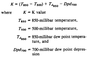 K Index K Value or K Index is a measure of thunderstorm potential based on the temperature lapse rate, the moisture content of the lower atmosphere, and the vertical extent of the moist layer. It should be used to analyze the potential for air mass thunderstorm occurrencenot potential occurrences of frontal thunderstorms and not for the potential severity of a thunderstorm. The temperature difference between the 850- and 500-millibar levels is the parameter used to find the vertical lapse rate, and the 850-millibar dew point and the 700-millibar dew point depression are used to evaluate the moisture content of the air, as well as the vertical extent of the moist layer. The K value is found as follows: