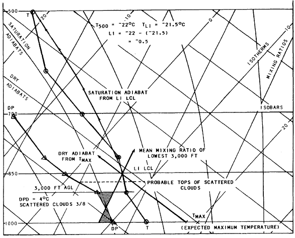 Figure 6-2-15.-Computation of the Lifted Index. Using the K Value as a predictor, you can determine the probability of thunderstorms with the following guidline: