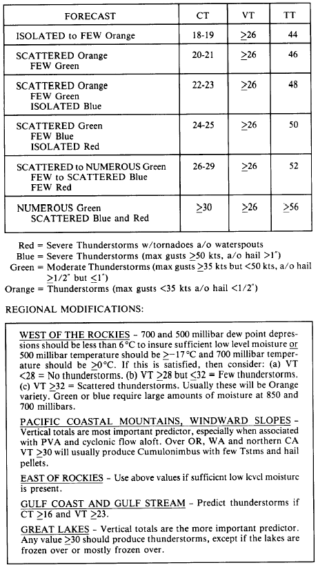 COMPUTATION OF CONVECTIVE ACTIVITY FORECAST GUIDES As the analyst of the Skew T diagram, you will calculate critical values upon which the forecaster will base his thunderstorm fore-cast. You have already determined that thunder-storms may occur and have used the indices to find a probability of occurrence and a prediction of the general strength of the expected thunder-storms. Now the forecaster must make a deter-mination of the maximum gusts expected and what size hail is expected, if any. With this information, the forecaster may issue a thunderstorm warning or recommend that the proper thunderstorm condition be set. The following techniques will allow you to cal-culate wind gust speed and direction, to determine if hail is expected, hail size, and the strength of turbulence expected in the convective activity. Table 6-2-1.-Relationship of Severe Weather Intensities to the Magnitude of Cross-, Vertical-, and Total-Totals Indexes