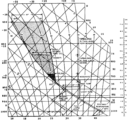 7. For the layer above 9,000 feet, project a moist adiabat upward from the CCL to the 400-millibar level. The maximum temperature difference between the moist adiabat and the free air temperature is the most turbulent layer. turbulence will be classified as follows: