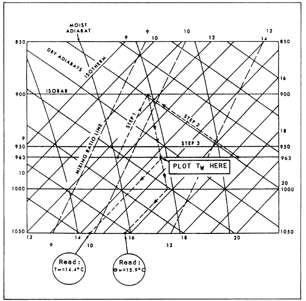 Figure 6-2-2.-Wet-bulb temperature and potential temperature. on the Skew T for the standard lavers routinely . evaluated. To compute layer thickness on plotted Skew T, follow these steps:1. Determine if the dew point curve through the layer indicates an average moisture greater than 3 g/kg.a. If the average moisture is greater than 3 g/kg, the virtual temperature curve should be constructed for the layer. b. If the average moisture is less than 3 g/kg, the difference between the virtual temperature curve and the actual temperature curve will be very slight, and the actual temperature curve may be used in place of a virtual temperature curve. 2. Bisect the virtual temperature curve (or actual temperature curve) through the layer with a vertical line so the area enclosed by your vertical line, the upper and lower isobars, and the temperature curve is approximately equal. See figure 6-2-3. 3. Read the layer thickness where your vertical line intersects the appropriate thickness scale. Freezing Level Freezing level is the height, or heights, in the atmosphere where the temperature falls below the freezing point of water. Finding it is a fairly straightforward process. Follow the plotted temperature curve up until you intersect the 0C isotherm. If your temperature curve is progressing from warmer to colder temperatures, you have a freezing level. Determine the height of this pressure level using the pressure-altitude curve. There may be more than one freezing level above a station at any one time. Learning Objective: Describe the computa-tion procedure used to find the forecast surface temperatures on the Skew T. |