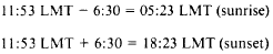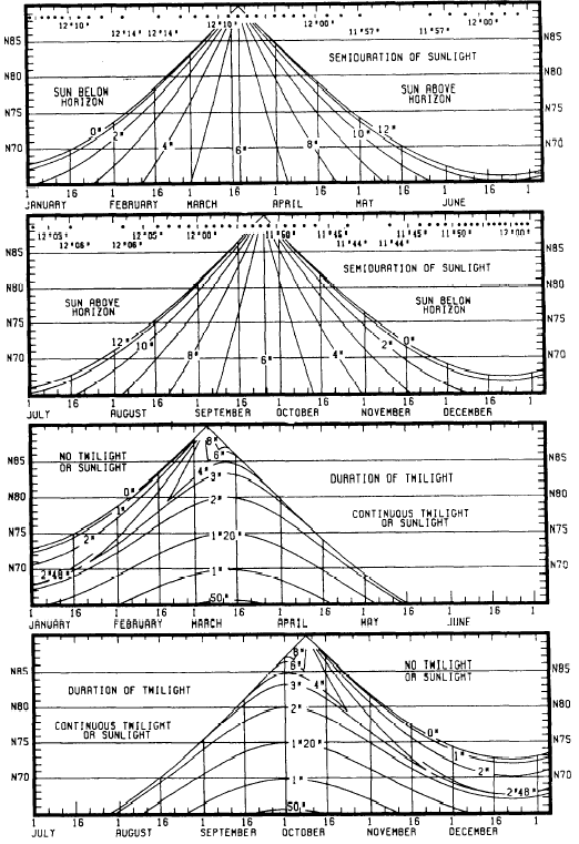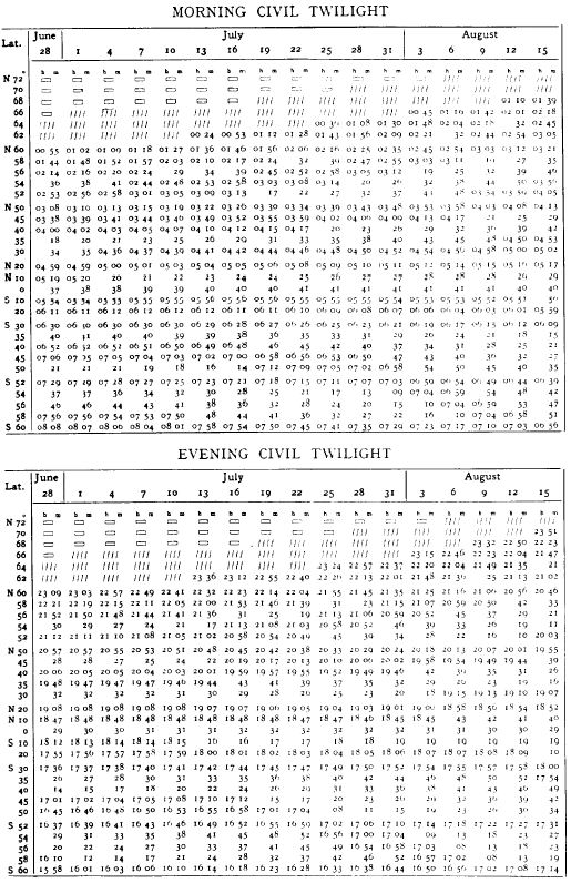 SUNLIGHT AND TWILIGHT GRAPHS The Sunlight and Twilight graphs (table 6-7-4) are used to compute sunrise, sunset, and twilight for latitudes north of 72N. As you can see, the table consists of two sets of graphs; the top two graphs are the Semiduration of Sunlight graphs, and the lower two graphs are the Duration of Twilight graphs.Semiduration of Sunlight Graphs The Semiduration of Sunlight graphs are the top two graphs of table 6-7-4. The upper graph covers the first 6 months of the year, and the lower graph covers the last 6 months. The months are broken down into 5-day increments across the bottom of the graphs. The latitudes 65N to 90N are listed on the sides, and a listing of Local Mean Times lies across the top.The curved or skewed lines in the graphs are the semiduration-of-sunlight lines semiduration meaning one-half of the total daylight period on a particular date. The semiduration line labeled 6, for example, indicates that there are 6 hours of daylight between the time of sunrise and noon LMT (one-half of the total time of daylight) and 6 hours between noon LMT and sunset (the other one-half of the daylight period).Two areas of each graph are without semiduration lines. The area to the left above the 0-hour semiduration line on the upper graph and the area to the right above the 0-hour semidura-tion line on the lower graph are labeled "Sun Below Horizon." If the intersection of a latitude and date falls within these areas, it means the Sun would remain below the horizon throughout the day at that latitude; sunrise would not occur. The area to the right above the 12-hour semiduration line on the upper graph and the area to the left above the 12-hour semiduration line on the lower graph are labeled "Sun Above Horizon." If the intersection of a latitude and date falls within these areas, the Sun would remain above the horizon throughout the day at that latitude; the Sun would not set.Lets try a couple of dates and latitudes and see how to use this graph to determine the times of sunrise and sunset.EXAMPLE 1: Date, July 16; latitude, 70N. Step 1. Locate 16 July along the date scale at the bottom of the lower graph and extend a line vertically to the top of the graph.Step 2. Locate latitude 70N and extend a line horizontally across the graph.Step 3. Where the two lines intersect, read the semiduration period. In example 1, the point of intersection falls within the "Sun Above Horizon" area. On this date at this latitude, the Sun does not set; it stays above the horizon all day.EXAMPLE 2: Date, 21 September; latitude, 75N.Step 1. Locate 21 September along the date scale on the lower graph and extend a line vertically so that it intersects the time scale at the top of the graph.Step 2. Read the time of meridian passage at the point where the date line intersects the time scale. The time is 11:53 LMT.Step 3. Locate 75N and extend a line horizontally across the graph to intersect the date line.Step 4. At the point of intersection, read the semiduration period. Since the point of inter-section falls approximately halfway between theTable 6-7-3.-Sample Page of Civil Twilight Data
