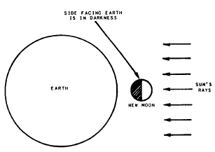 Figure 6-8-1.-Earth-Moon-Sun relationship during New Moon phase. is between the Moon and the Sun. The side facing Earth is now totally illuminated, while the side facing away from Earth is in darkness. See figure 6-8-2. Starting with the New Moon, the Moon passes through the following phases as it orbits Earth: New Moon, 1st-quarter Moon, Half-Moon, 2d-quarter Moon, Full Moon, 3d-quarter Moon, Half-Moon, 4th-quarter Moon, and New Moon. Figure 6-8-3 shows the moon phases as they occurred between 5 January 1989 and 3 February 1989.The times of moonrise and moonset can be estimated by timing the passage of the Moon across the nighttime sky during a particular phase. Each phase has its own time relation-ship with regard to crossing the meridian of the nighttime sky. For example, during a Full Moon, the Moon reaches the meridian approximately 6 hours after rising. From the meridian, it takes 6 more hours to set. The reason the time of moonrise and moon-set can only be estimated using the phases of the Moon is the Moons orbit. It is NOT constant about Earth. Changes in the orbit cause changes in the times of moonrise and moonset.Learning Objective: Identify the two factors in the Moons orbit that cause daily changes in the time of moonrise and moonset. |
