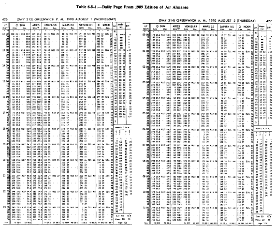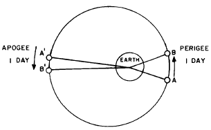 Figure 6-8-6.-Variation in Moons orbital speed at apogee and perigee. appears on the A.M. pages, while the Moon-set table appears on the P.M. pages. Moon-rise and moonset are formulated in three columns.LATITUDE COLUMN. Latitudes between 72N and 60S are listed vertically in the column labeled Lat. Note that the latitude increments vary. Between 72N and 50N, the increments are 2 degrees; while between 50N and 30N, the increments are 5 degrees, etc.MOONRISE AND MOON SET COLUMNS. The times of moonrise and moonset are listed in the Moonrise/Moonset columns. The times are listed in hours (h) and minutes (m) GMT. These times are also Local Mean Time (LMT). A time taken from this table applies to each standard longitude meridian around Earth. The standard meridians occur every 15 degrees on either side of the Prime Meridian (0).Interpolation of the time maybe necessary if the latitude of the location for which you are computing moonrise and moonset falls between two of the latitudes listed in the Lat. column. For example, if you are computing moonrise and moonset for 37N, you will find that 37 is NOT listed in the Lat. column. There-fore, the time of moonrise and moonset must be interpolated using the latitudes closest to 37N in the Lat. column (35N and 40N). Refer to lesson 7 if you need to refresh your memory on interpolating time.Two symbols may or may not appear in this column. They are