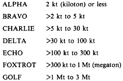 NUCLEAR BURSTS Nuclear bursts produce clouds that contain radioactive matter. This matter eventually returns to Earths surface as RADFO. The height to which these clouds rise is dependent principally upon the yield of the nuclear weapon, and the type of burst. Weapon Yield Weapon yield determines the energy released in a nuclear blast and the height to which radio-active material will ascend into the atmosphere. For example, if a 1-kiloton (kt) nuclear burst occurs at or near the surface, the nuclear cloud that forms will rise to a height of approximately 3,800 meters, or 12,500 feet. A 1-kt nuclear burst is equal to an explosion of 1,000 tons of TNT. Nuclear bursts are divided into seven yield (pre-selected) groups for use with certain RADFO messages and computations. The weapon yield breakdown is as follows: Types of Nuclear Bursts There are four types of nuclear bursts: high-air, low-air, surface, and subsurface. HIGH-AIR BURST. A high-air burst does NOT damage targets or cause casualties on the surface. Neither induced-radiation nor fallout are of tactical significance there. High-air bursts are designed to disrupt communications. LOW-AIR BURST. A low-air burst pro-duces damage or casualties at the surface; however, the burst is at such a height as to produce minimal fallout. In a low-air burst, only neutron radiation occurs. Neutron-induced radiation is relatively limited in area, and changes in tactics can normally be made to ensure that it does not grossly interfere with operations. SURFACE BURST. Both neutron-induced radiation and fallout result from a surface or near-surface burst. The fallout pattern usually overlaps and overshadows the entire induced-radiation pattern. RADFO messages are based on a surface or near-surface burst. SUBSURFACE BURST. A subsurface burst produces both induced radiation and fallout on the ground. |