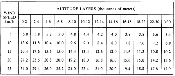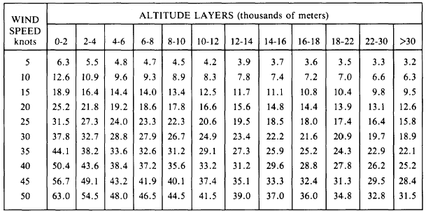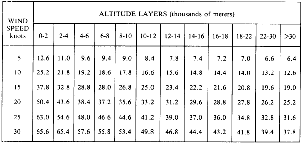 Note: Above 18,000 meters, altitude layers for plotting vector diagrams continue to be at 2,000 meter intervals. However, the map distance factors vary so little that some of the columns in the above table are combined for convenience. |