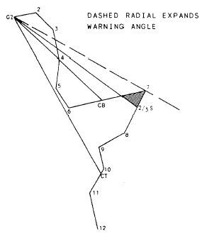 Figure 6-9-5.-Example of wind vectors extending beyond radials and angle expansion.bisect the angle but then expand the angle to 40 degrees by drawing two additional radials. See figure 6-9-6. THE ORIENTATION OF THE BISECTING LINE IS THE EFFECTIVE DOWNWIND DIRECTION. |