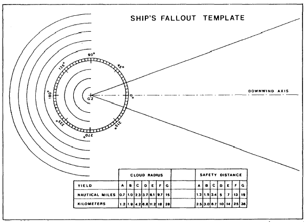 Figure 6-9-13.-Ships Fallout Template. determined from the graph in figure 6-9-14. Safety distance allows for unlimited cloud size, diffusion, and wind fluctuations.3. Plot the distance obtained in step 1, and the two safety distances obtained in step 2 on the template using GZ as the center. Draw these distances as two arcs across the fallout pattern between the radial lines. In most cases, the area enclosed by the two safety distance arcs and radial lines is the zone of deposited fallout (at the surface) at the specified time after detonation.Example: Determine the area where the fallout will fall 1.5 hours after detonation with an effective down-wind speed of 16 knots. Determine safety distances, using yield group Delta. 16 knots x 1.5 hours = 24 nautical miles (nmi) With GZ as the center and 24 nmi as the radius, draw a dotted arc across the fallout field at 24 nmi. This arc represents the middle of the area within which fallout may be expected to reach the surface at H+1.5 hours. From the template, the safety distance for yield group Delta is 5 nmi. Add 5 nmi to and subtract 5 nmi from 24 nmi: